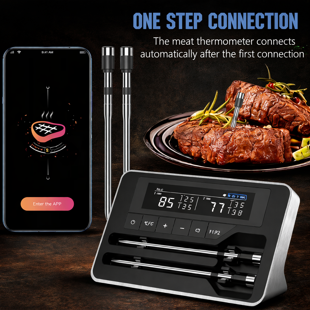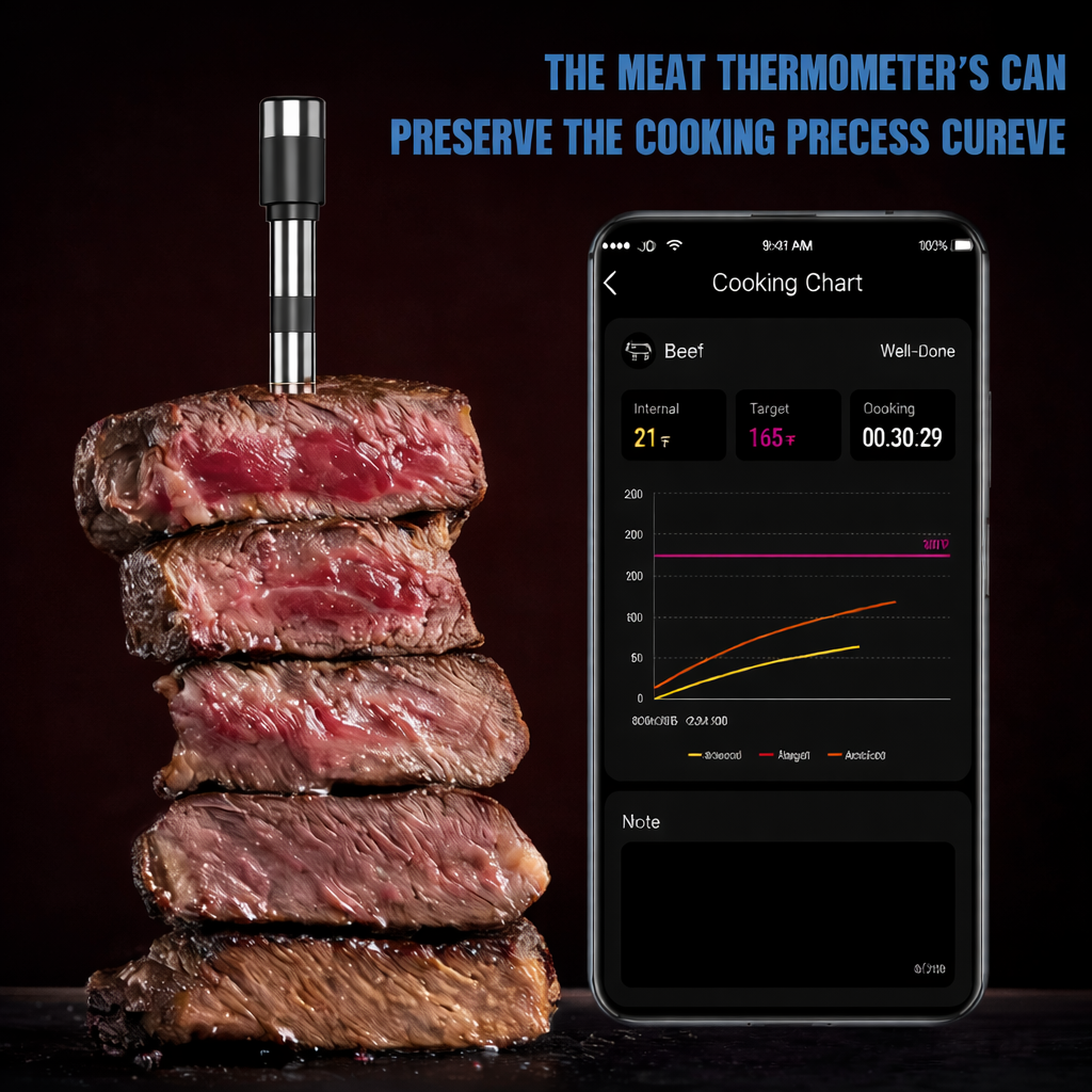 Designed to bring calm and confidence into everyday cooking, this smart wireless food thermometer helps you achieve perfectly cooked meals without the guesswork. From slow roasts to high-heat grilling, it gives you gentle guidance throughout the cooking process so you can focus on the moment — not the temperature.